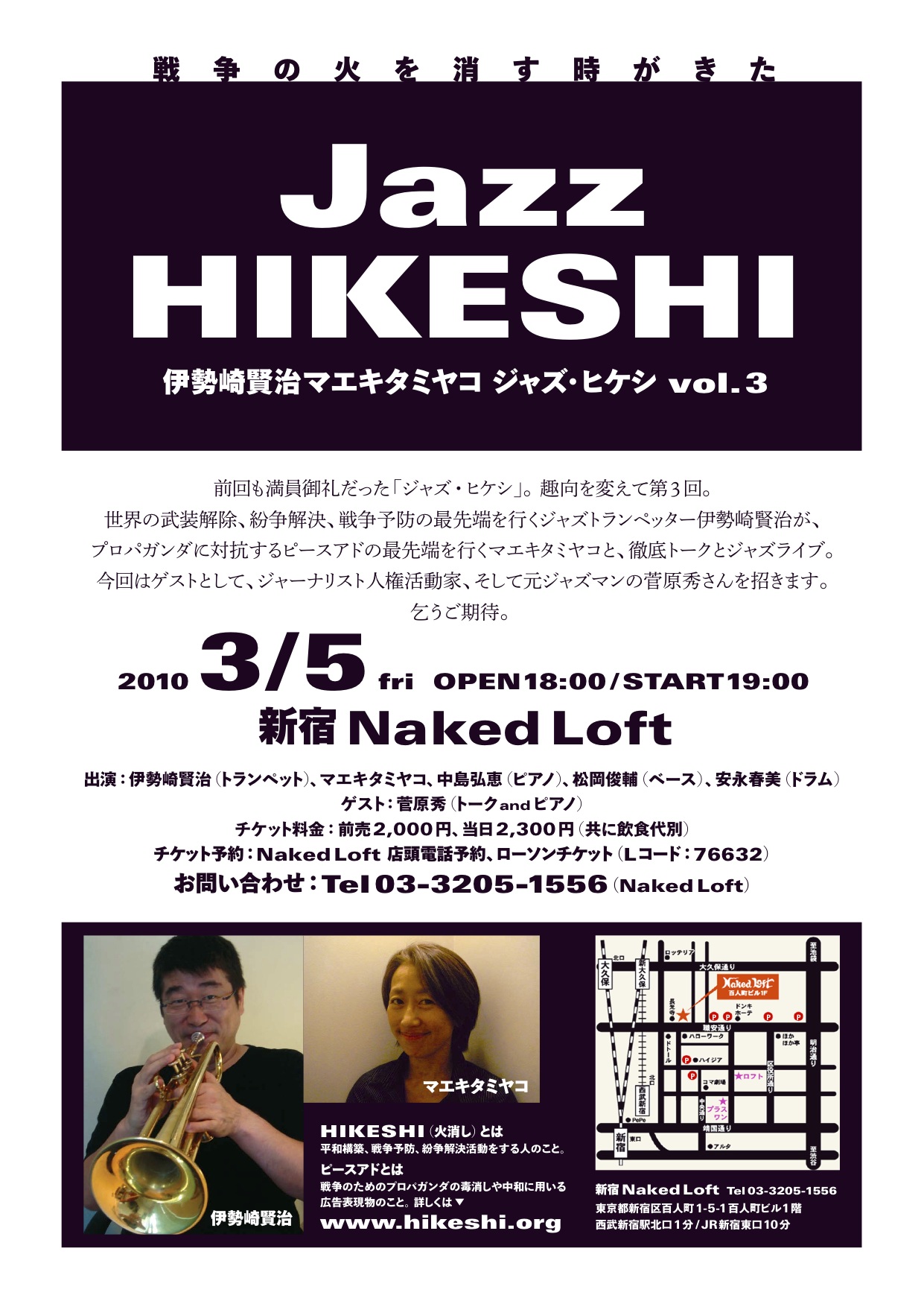 前回も満員御礼だった「ジャズ・ヒケシ」。趣向を変えて第 3 回。 世界の武装解除、紛争解決、戦争予防の最先端を行くジャズトランペッター伊勢崎賢治が、 プロパガンダに対抗するピースアドの最先端を行くマエキタミヤコと、徹底トークとジャズライブ。 今回はゲストとして、ジャーナリスト人権活動家、そして元ジャズマンの菅原秀さんを招きます。 乞うご期待。