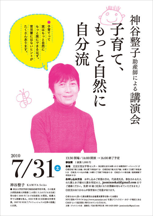 2007年にはNHK『プロフェッショナル仕事の流儀』にも出演。人気漫画家・桜沢エリカさんや、女優・ともさかりえさんの自宅出産を介助したことでも有名な、神谷整子助産師による講演会が文京区で開催されます。