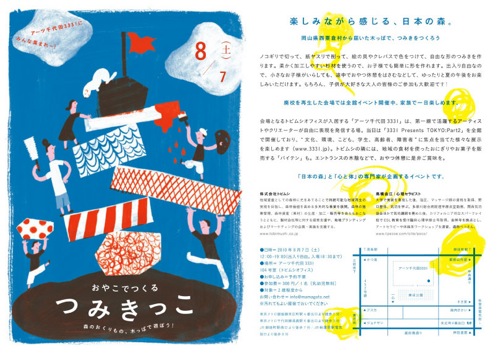 岡山県西粟倉村から届いた木っぱで、つみきをつくろうノコギリで切って、紙ヤスリで削って、絵の具やクレパスで色をつけて、自由な形のつみきを作ります。柔かく加工しやすい杉材を使うので、お子様でも簡単に形を作れます。出入り自由なので、小さなお子様がいらしても、途中でおやつ休憩をはさむなどして、ゆったりと夏の午後をお楽しみいただけます。もちろん、子供が大好きな大人の皆様のご参加も大歓迎です!