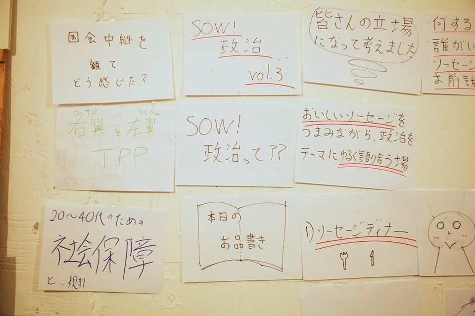 「Sow!政治」はおいしいソーセージをつまみながら政治をテーマにゆるく語り合うイベントです。