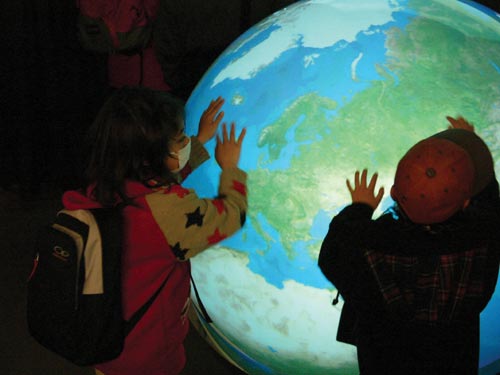 インタラクティブなデジタル地球儀「触れる地球」は、関心のある場所を指で触れると、センサーがその地域に関連する写真を、モニターに映し出すようにプログラムされています。
