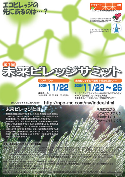 「お金」よりも「いのち」を大切に、いまいちど自然とのきずなや人間どうしの調和に重きを置いた、古くて新しいコミュニティ。そんな共同体を、私たちは「未来ビレッジ」と名づけ、そのありかたをこれから探っていきたいと思います。いま世界中で、「エコビレッジ」など新しいタイプの未来型コミュニティづくりが進められています。しかしまだまだ実例が少ない状況です。このままでは、環境やこころの破壊のスピードには追いつきそうもありません。未来ビレッジづくりをもっと広く、早く普及させるには、個別の団体の活動では限界があります。推進する各団体が力を合わせて取り組む必要があります。この未来ビレッジサミットは、コミュニティ運動のネットワーク化を図るために、日本各地の実践者、賛同者を集めると共に、アジア各国の実践者を招き実例を紹介し、未来ビレッジのあり方、進め方、ネットワークのつくり方を話し合います。同時に実例の体験会を開催し、相互交流や理解を深めます。